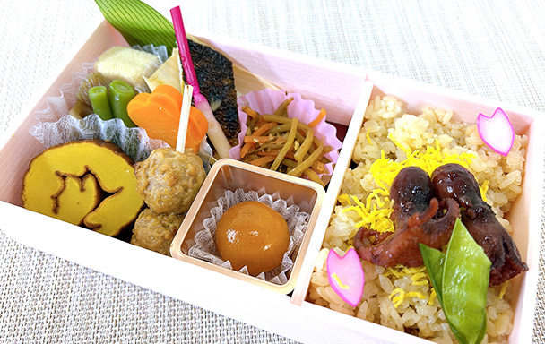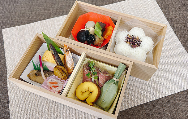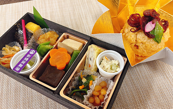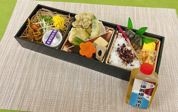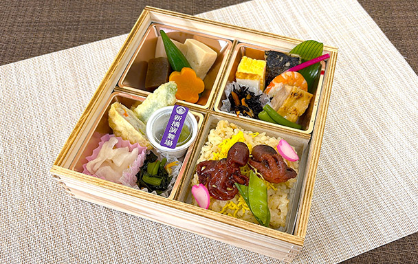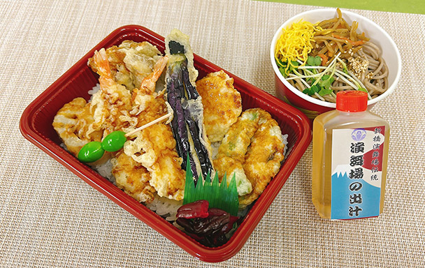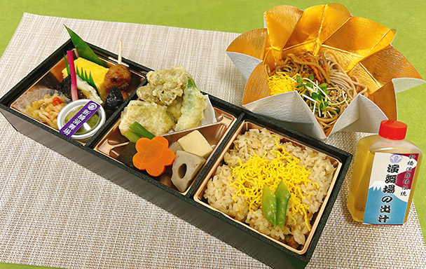 演舞場伝統の出汁を使用した劇場でも人気の煮物、冷めてもおいしくお召し上がれるように仕上げた天婦羅を盛り合わせております。